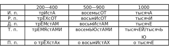 В числительных 200, 300, 400 склоняются также обе части, но «сто» имеет каждый раз разное окончание. Похожая ситуация с числительными от 500 до 900 («сто» имеет каждый раз разное окончание), но «пять», «шесть», «семь», «восемь», «девять» склоняются так же, как слова «степь» и «кость». Числительное 1000 склоняется как существительное первого склонения, например «песня». Сюда же следует добавить склонение слов «полтора» и «полтораста», которые имеют, кроме форм именительного и винительного падежей, формы «полутора», «полутораста».