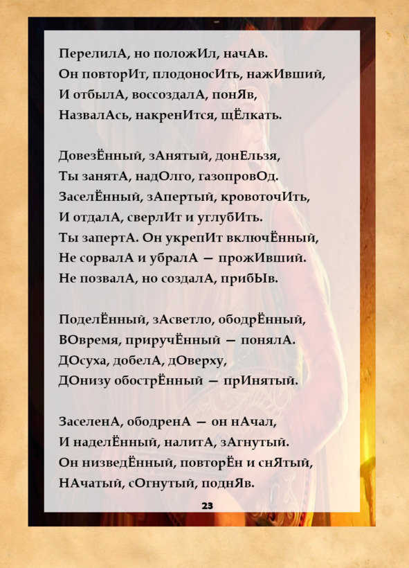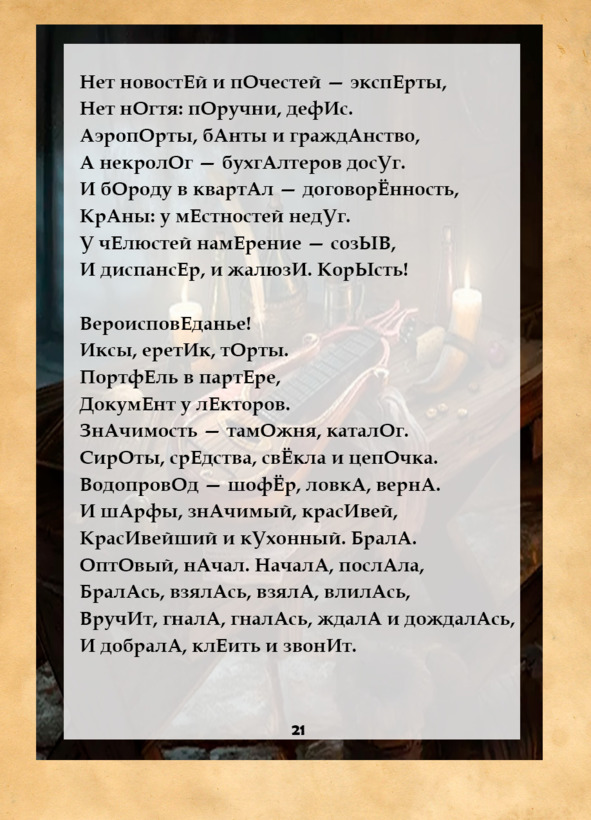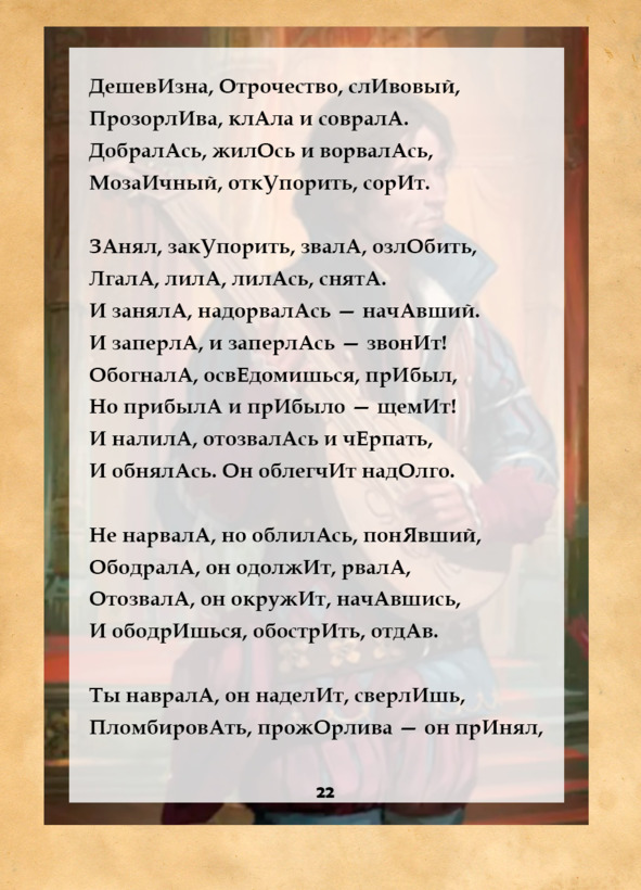 Чтобы правильно выполнить это задание, нужно на подсознательном уровне знать, как слово звучит. Для этого существует специальный метод, который вам в этом поможет, – песня ударений. В этой книге я предлагаю вам вариант песни, которую можно будет напевать хоть каждый день, и уже скоро ваш мозг запомнит правильное ударение во всех словах, приведенных в орфоэпическом словнике этого года. Напевайте песню ударений, как Лютик пел свою небезызвестную балладу о бесстрашном ведьмаке Геральте из Ривии, – и вы без труда справитесь с заданием!