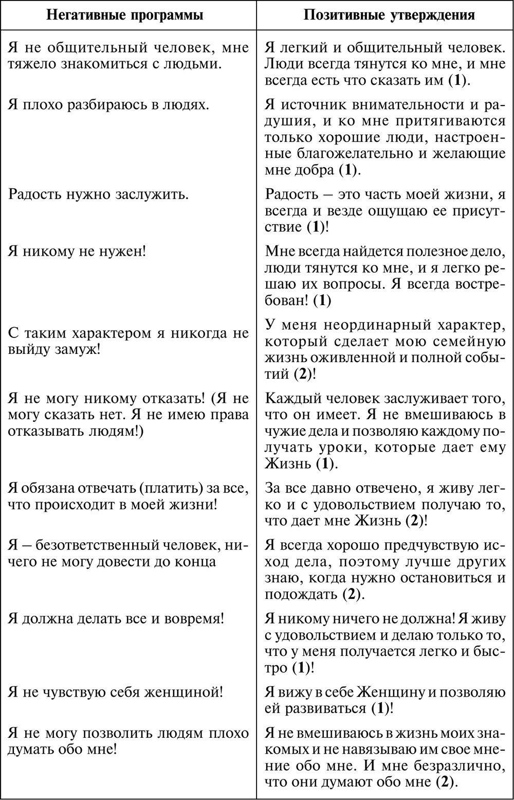 В таблице приведены лишь варианты позитивных утверждений, которые позволяют избавиться от негативных программ. Вы можете составить себе иные позитивные утверждения, лишь бы они были вам близки, понятны и вызывали у вас приятные ощущения.