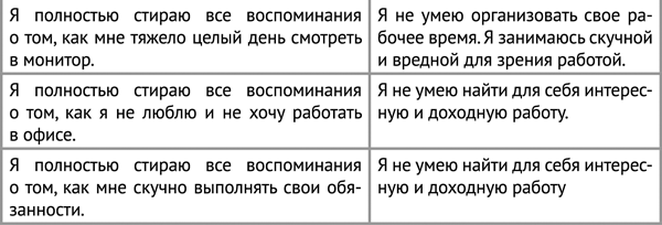 Так обычно выявляют негативные убеждения на одно-двухдневных тренингах. Времени мало, поэтому особенно углубляться в свои переживания некогда. Выбираются 5–6 самых очевидных негативных убеждений, и проводится работа по их замене на позитивные установки.