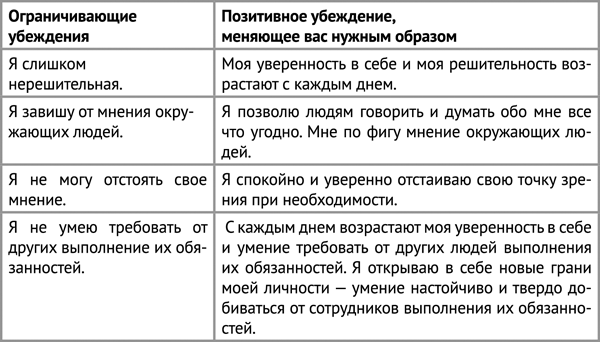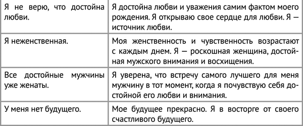 Затем необходимо заменить эти убеждения на такие, которыми обладает ваша «идеальная Я», для которой выйти замуж – плевое дело. Назовем эти новые убеждения «позитивными».