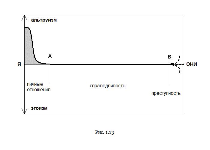 Умозрительный рост длины горизонтального участка – от первобытного нуля на рис. 1.2 до будущего охвата всего прогрессивного человечества – визуальное проявление этического прогресса, который все таки есть, несмотря на все очевидные препятствия. Угол наклона участка, т.е. 0, говорит нам о справедливости, которая одинаково наклоняется ко всем членам общества или же, напротив, к одним – больше, а к другим меньше. Расстояние от горизонтальной оси, т.е. совпадение с ней – как много в отношениях эгоизма или альтруизма, которых там нет совсем или же которые проявляются в пренебрежении взаимными интересами, в попытках получить односторонние преимущества или завести личные отношения путем уступок. Длина горизонтального участка (а вернее расстояние от слова "Я" до В) – насколько далеко такие люди могут отстоять друг от друга в обществе, своего рода "радиус доверия".