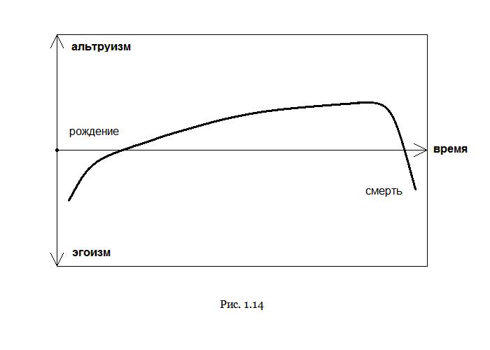 Для исследования этого вопроса нам поможет еще один художественный график, где представлено изменение моральных чувств человека по мере проживания им своей нелегкой, полной обязанностей жизни (рис. 1.14). Что выражает восходящая линия? Линия эта, взятая уже не из размышлений, а из жизненного опыта, выражает "социализацию" – изменение отношения к окружающим. Как знают все родители, дети в детстве страшно эгоистичны и чтобы привить им мало-мальски приличные социальные качества, требуются неимоверные усилия. Но зато чем они физически более взрослые и социально более зрелые, тем они, теоретически, больше заботятся о других – и о собственных детях, и о женах, и о родителях, а кое-кто даже успевает позаботиться о человечестве в целом. Но если о ребенке заботится два человека – папа с мамой, то самому ему потом приходится заботиться не о папе с мамой, а о массе людей. И значит, что нормальный человек в итоге все же получается больше альтруист, чем эгоист, просто этот альтруизм скрыт где-то в личной, излишне раздутой сфере. И значит картинка 1.13 может быть вполне реалистична, если принять, что она подразумевает человека созревшего, состоявшегося и нагруженного ответственностью за человечество, а не за свой круг. Особенно замечательно это наблюдение тем, что открывает нашему взору то, что и так давно известно – чем прочнее семья, чем ценнее в ней семейные ценности, тем альтруистичнее в конце концов вырастает человек. Т.е. истинный, семейный альтруизм, воспитывающий свободного человека, обладает замечательным свойством смещать график вверх – чем больше альтруизма в семье, тем меньше эгоизма вне ее. Иными словами, альтруизм порождает альтруизм.