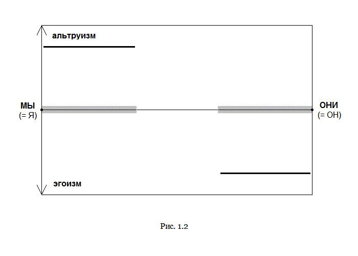 Теперь пора приступить к обещанному черчению. Первобытный коллектив, нарисованный нашим воображением, выглядел как на рис. 1.1: сплошной равномерный круг – все общее, все как один, большая верная семья. Полная тождественность "я" и "мы". А вокруг, поодаль – и чем дальше, тем лучше – прочие круги, вражеские, "они". Или, точнее, "он". Большие и маленькие, все они озабочены одним – как жить дальше. И для этого желательно истребить соседей, пока они не успели истребить нас. В переводе на язык морали, которая пока еще не слишком отличалась от животного инстинкта, свои – это всё хорошее, чужие – всё плохое. По отношению к своим человек – полный альтруист, по отношению к тем, другим – полный, до степени абсолютного антагонизма, эгоист (рис. 1.2). Иными словами, абстракция "всё хорошее", несмотря на животный примитивизм, влекла за собой вполне конкретные ценностные ориентиры. Первой ценностью был свой коллектив, члены которого не просто исключались из питательного рациона, но были частью коллективной души и тела.