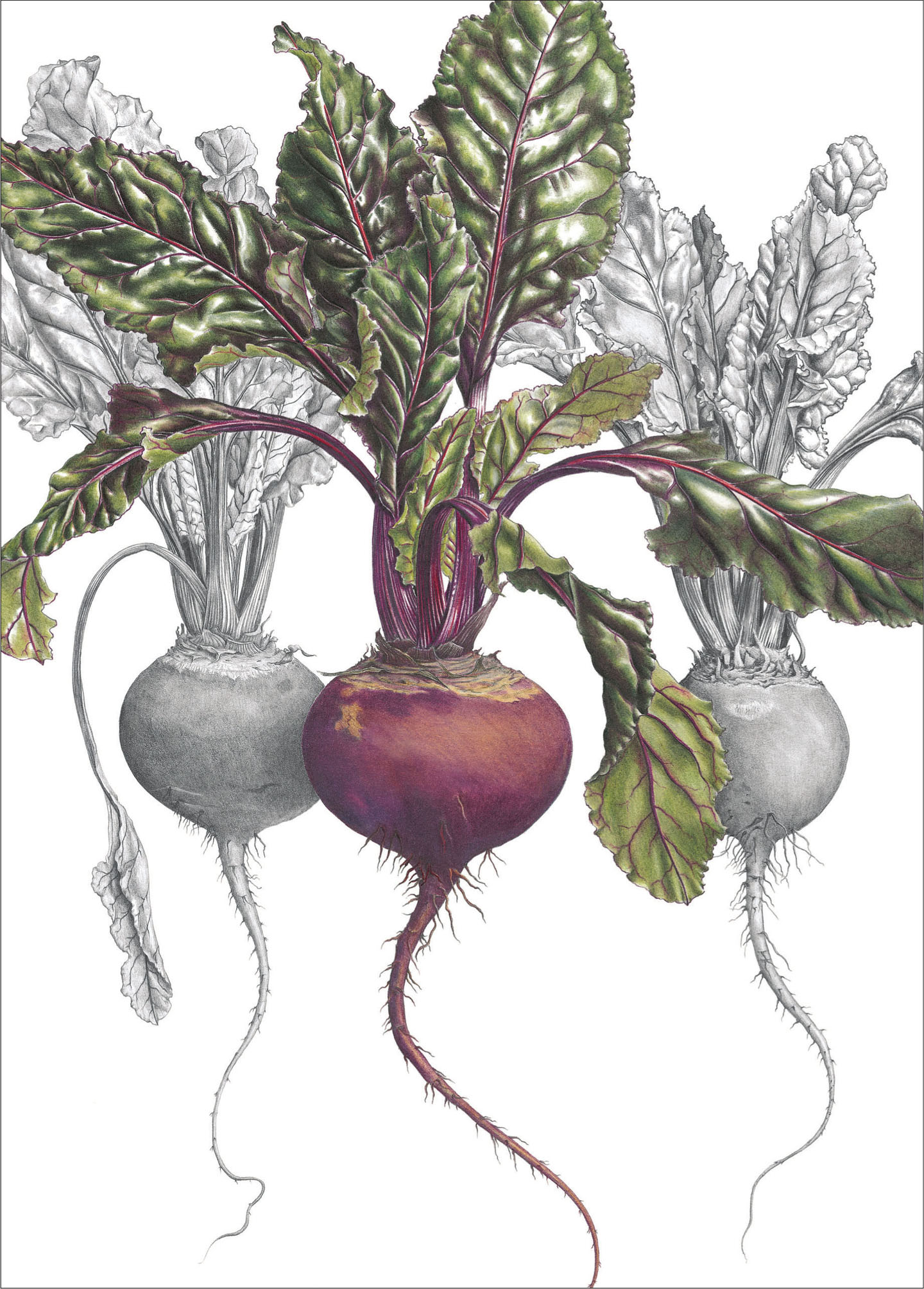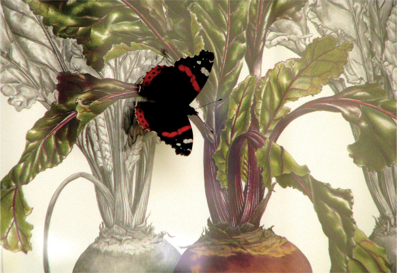 ∆ A watercolourist recently described coloured pencil as being of no use for depicting fine detail. Maybe this butterfly, which repeatedly tried to land on my drawing of beetroot at an exhibition, had not read those words!