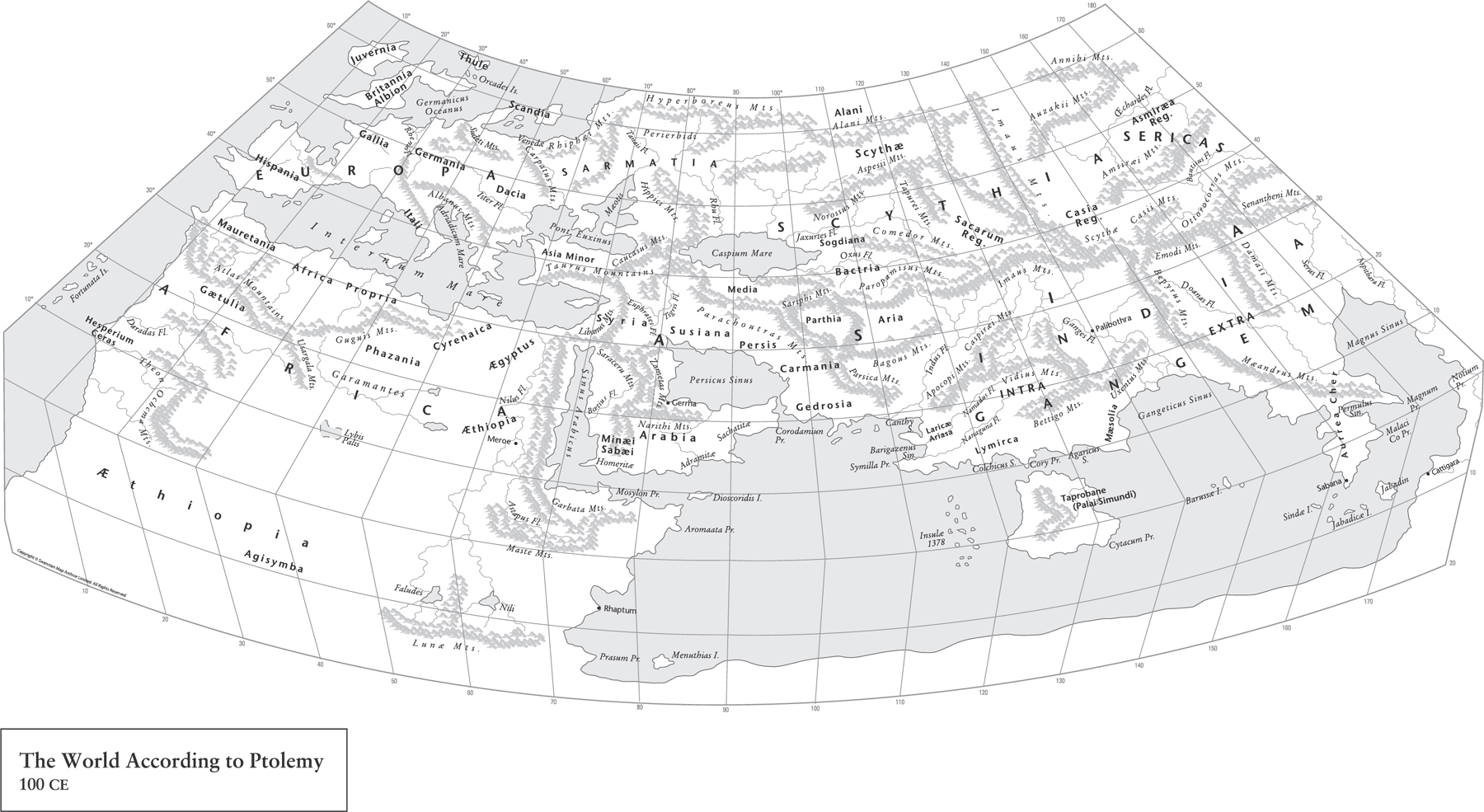 Map 9. Ptolemy’s maps were the first to use longitudinal and latitudinal lines as well as specifying terrestrial locations by celestial observations.