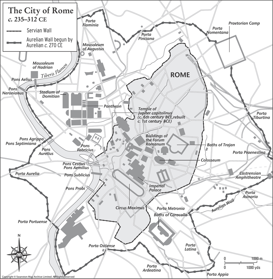 Map 7. The Servian and Aurelian walls were built to protect the city of Rome, which was becoming increasingly vulnerable to attacks from Germanic tribes in the 3rd century CE.