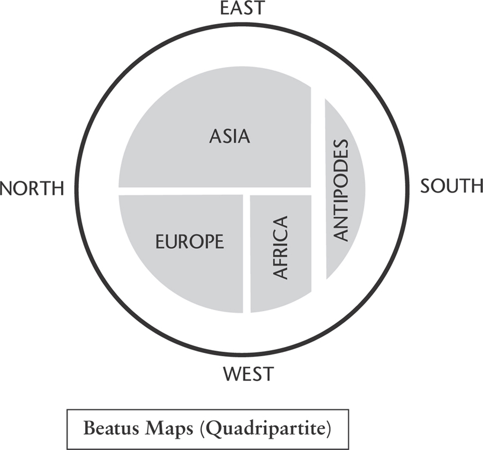Map 13. These maps represent a kind of amalgam of Zonal and T–O maps and include a fourth, unknown continent, sometimes labelled ‘Antipodes’.