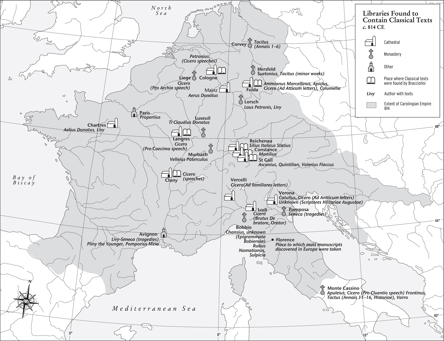 Map 15. Some classical texts survived within the Carolingian Empire and many surviving texts were taken to the city of Florence.