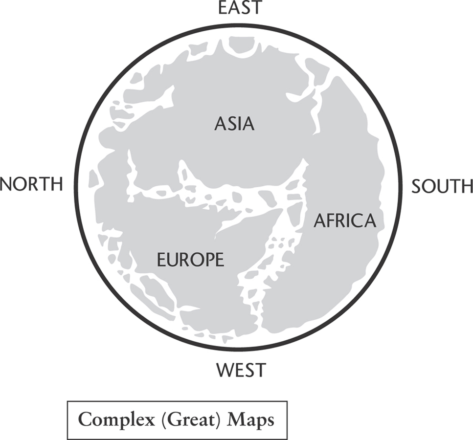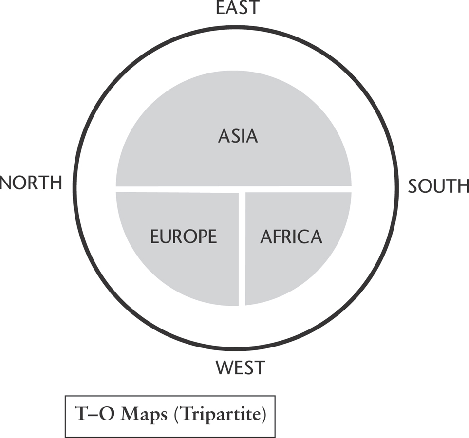 Next (though in no particular order) are T-O (sometimes called the ‘Tripartite’) maps These offered a simplified description of geography, showing only the inhabited regions of the world as known to Roman and medieval scholars. The world map was illustrated within a circle, with the three land areas – Europe, Africa and Asia – divided by a T shape, representing water that reached out to a circular ocean. Most of these maps placed east (oriens in Latin) at the top, giving us the term ‘orienting’. These maps also resolved the problem of an unknown race by completely ignoring the possibility, at least geographically. Isidore, Archbishop of Seville (580–636 CE), used this style of map in his epic Etymologiae (‘Origins’), a collection of works from antiquity that would probably have been lost without his efforts.