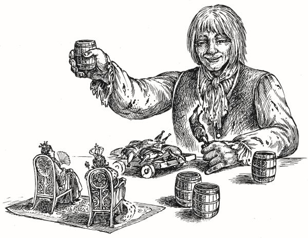 Двадцать человечков Гулливер брал в руки и ставил прямо к себе на стол. Остальные сто работали внизу. Одни подвозили кушанья в тачках или подносили на носилках, другие подкатывали к ножке стола бочки с вином.