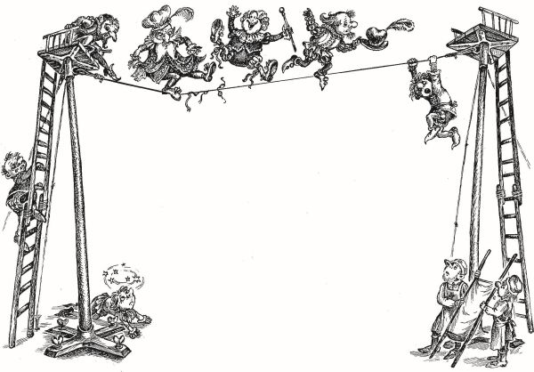 Но на этот раз император решил устроить канатные пляски не во дворце, а под открытым небом, перед замком Гулливера. Ему хотелось удивить Человека-Гору искусством своих министров.