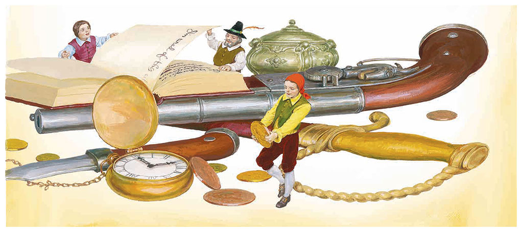 Внутри этого круглого предмета, очевидно, сидит какое-то таинственное существо, которое не переставая стучит не то зубами, не то хвостом. Человек-Гора объяснил нам – частью словами, а частью движениями рук, – что без этого круглого металлического ящика он бы не знал, когда ему вставать утром и когда ложиться вечером, когда начинать работу и когда её кончать. 8. В левом нижнем кармане жилета мы видели вещь, похожую на решётку дворцового сада. Острыми прутьями этой решётки Человек-Гора расчёсывает себе волосы. 9. Закончив обследование камзола и жилета, мы осмотрели пояс Человека-Горы. Он сделан из кожи какого-то громадного животного. С левой стороны на нём висит меч длиной в пять раз более среднего человеческого роста, а с правой – мешок, разделённый на два отделения. В каждом из них можно легко поместить троих взрослых лилипутов. В одном из отделений мы нашли множество тяжёлых и гладких металлических шаров величиной с человеческую голову; другое до краёв полно какими-то чёрными зёрнами, довольно лёгкими и не слишком крупными. Мы могли поместить у себя на ладони несколько десятков этих зёрен. Такова точная опись вещей, найденных при обыске у Человека-Горы. Во время обыска вышеназванный Человек-Гора вёл себя вежливо и спокойно.