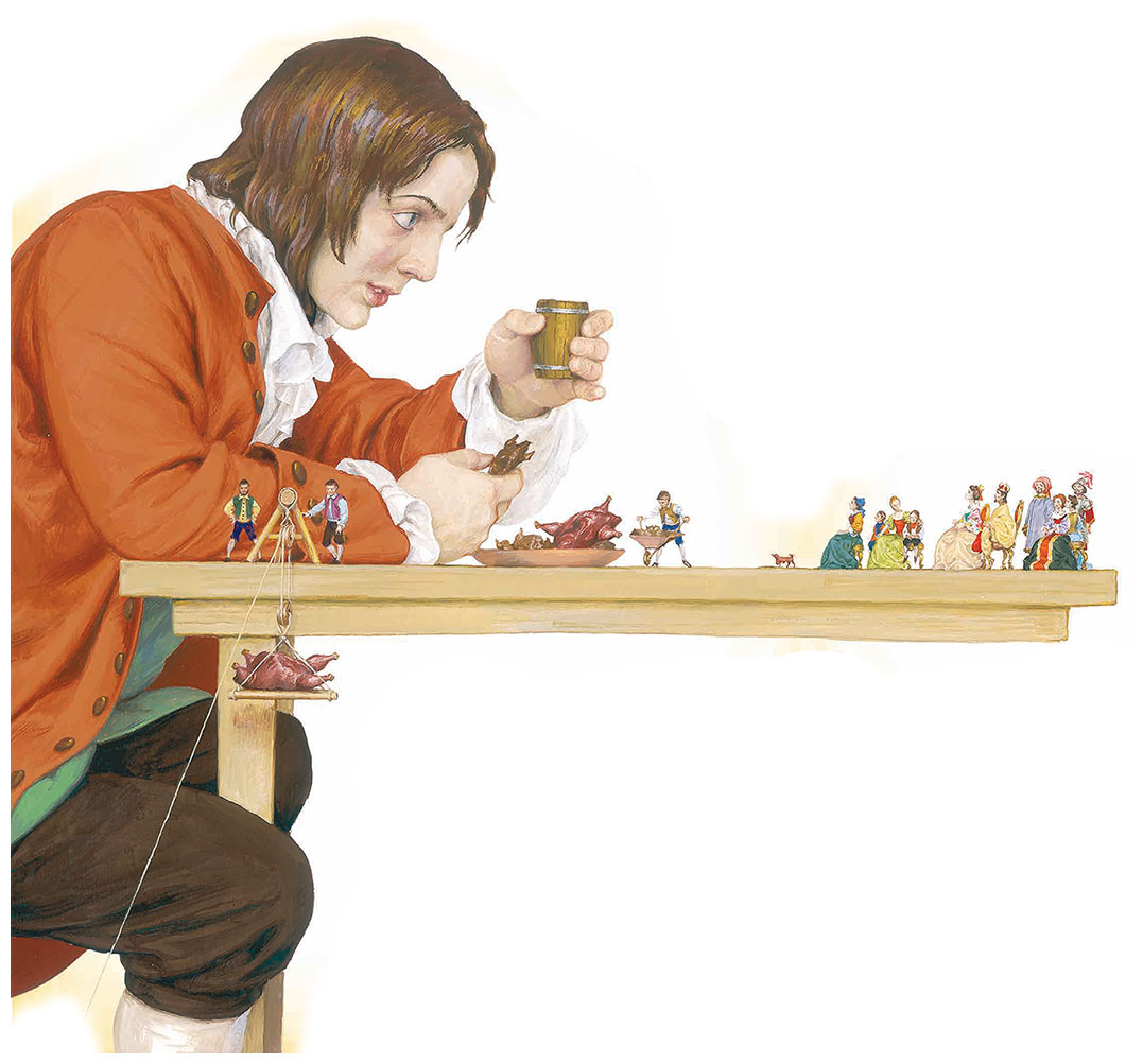 Двадцать человечков Гулливер брал в руки и ставил прямо к себе на стол. Остальные сто работали внизу. Одни подвозили кушанья в тачках или подносили на носилках, другие подкатывали к ножке стола бочки с вином.