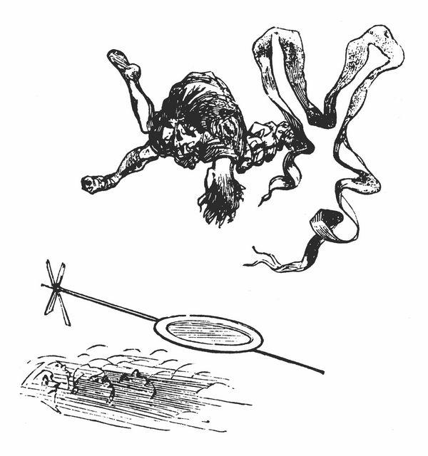 В пути она порядком попортилась, потому что возчики пробили в её полях две дыры и всю дорогу волокли шляпу на длинных верёвках. Но всё-таки это была шляпа, и Гулливер надел её на голову.