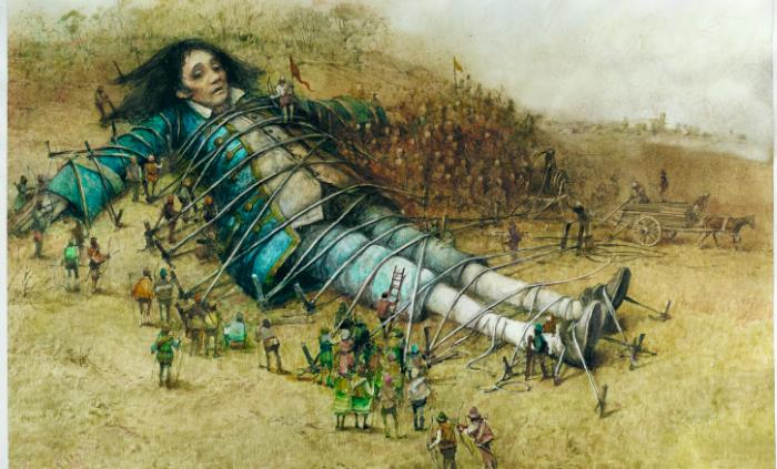 Вскоре я почувствовал, как что-то живое задвигалось у меня на левой ноге, осторожно пробралось мне на грудь и приблизилось к подбородку. Опустив глаза, я различил перед собой человека ростом не более шести дюймов, с луком и стрелой в руках и колчаном за спиной. В то же время я почувствовал, что за ним следует ещё по крайней мере около сорока подобных ему созданий. От изумления я так громко вскрикнул, что, соскакивая с меня на землю, некоторые из них получили ушибы. Однако они скоро вернулись. Один смельчак рискнул подойти так близко к моему лицу, что мог видеть его целиком. В знак изумления он поднял руки, закатил глаза и крикнул пронзительным, но чётким голосом: «Гекина дегуль!» Другие несколько раз повторили эти слова, но тогда я ещё не знал, что они значат.