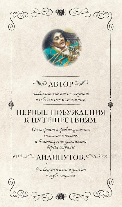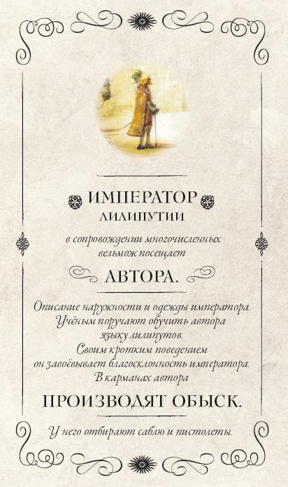 Теперь я постараюсь описать наружность его величества. Он почти на мой ноготь выше своих придворных; одного этого было довольно, чтобы внушать почтительный страх окружающим. Черты лица его были резки и мужественны; губы слегка вывернутые, нос орлиный, цвет лица оливковый, стан прямой, руки и ноги красивой формы, движения грациозные, осанка величественная. Император не первой молодости – ему двадцать восемь лет и девять месяцев; и он благополучно царствует уже семь лет. Чтобы лучше рассмотреть его величество, я лёг на бок, так что моё лицо пришлось как раз против него, причём он стоял на расстоянии всего трёх ярдов от меня. Впоследствии мне не раз случалось брать его на руки, и потому я не мог ошибиться в его описании.