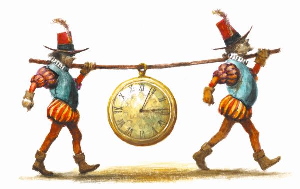Отдал я и часы. Император осмотрел их с большим любопытством и приказал двум самым сильным гвардейцам унести их, надев на шест. Гвардейцы надели часы на крепкий шест и, подняв на плечи, унесли прочь, как в Англии таскают бочонки с элем. Более всего поразили императора непрерывный шум часового механизма и движение минутной стрелки. Лилипуты обладают несравненно лучшим зрением, чем мы, и его величество сразу заметил, что эта стрелка находится в непрерывном движении. Он предложил учёным выяснить, для чего служит эта машина. Но читатель и сам догадается, что учёные не пришли ни к какому единодушному заключению. Все их предположения были весьма далеки от истины.