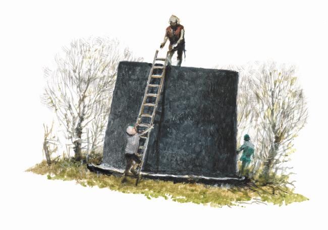 Я взял девять палок и крепко вбил их в землю в виде квадрата, каждая сторона которого была длиной два с половиной фута; на этих девяти кольях я туго натянул носовой платок, а сверху прикрепил к четырём углам квадрата ещё четыре палки параллельно земле. Эти палки, возвышаясь над платком приблизительно на пять дюймов, образовали с каждой стороны нечто вроде барьера.