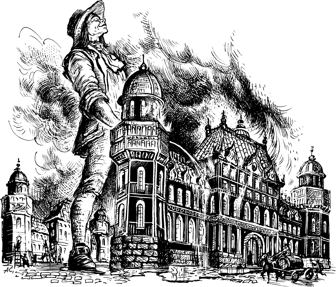 Читатель, может быть, помнит, что в числе условий, на которых мне была дарована свобода, были очень для меня унизительные и неприятные, и только крайняя необходимость заставила меня принять их. Но теперь, когда я носил титул нардака, самый высокий в империи, взятые мной на себя обязательства роняли бы мое достоинство, и надо отдать справедливость императору, он ни разу не напомнил мне о них. Однако незадолго перед тем мне представился случай оказать его величеству замечательную услугу, как по крайней мере мне тогда казалось. Раз в полночь у дверей моего замка раздались крики тысячной толпы; я в испуге проснулся и услышал непрестанно повторяемое слово борглюм. Несколько придворных, пробившись сквозь толпу, умоляли меня явиться немедленно во дворец, так как покои императрицы были объяты пламенем по небрежности одной фрейлины, которая заснула за чтением романа, не погасив свечи. В одну минуту я кое-как оделся; был отдан приказ очистить для меня дорогу; кроме того, ночь была лунная, так что мне удалось добраться до дворца, никого не растоптав по пути. К стенам дворца уже были приставлены лестницы, было собрано много ведер, но вода была далеко. Каждое ведро равнялось нашему большому наперстку, и бедняги с большим усердием подавали их мне, однако пламя было так сильно, что это усердие приносило мало пользы. Я мог бы легко затушить пожар, накрыв дворец своим кафтаном, но второпях я успел надеть только кожаную куртку. Казалось, дело находилось в самом плачевном и безнадежном положении, и этот великолепный дворец, несомненно, сгорел бы дотла, если бы, благодаря необычному для меня присутствию духа, я внезапно не придумал средство спасти его. Накануне вечером я выпил много превосходнейшего вина, известного под названием глимигрим (блефускуанцы называют его флюнек, но наши сорта выше), которое отличается сильным мочегонным действием. По счастливой случайности я еще ни разу не облегчился от выпитого. Между тем жар от пламени и усиленная работа по его тушению подействовали на меня и быстро обратили вино в мочу; я выпустил ее в таком изобилии и так метко, что в какие-нибудь три минуты огонь был потушен, и остальные части величественного здания, воздвигавшегося трудом нескольких поколений, были спасены.