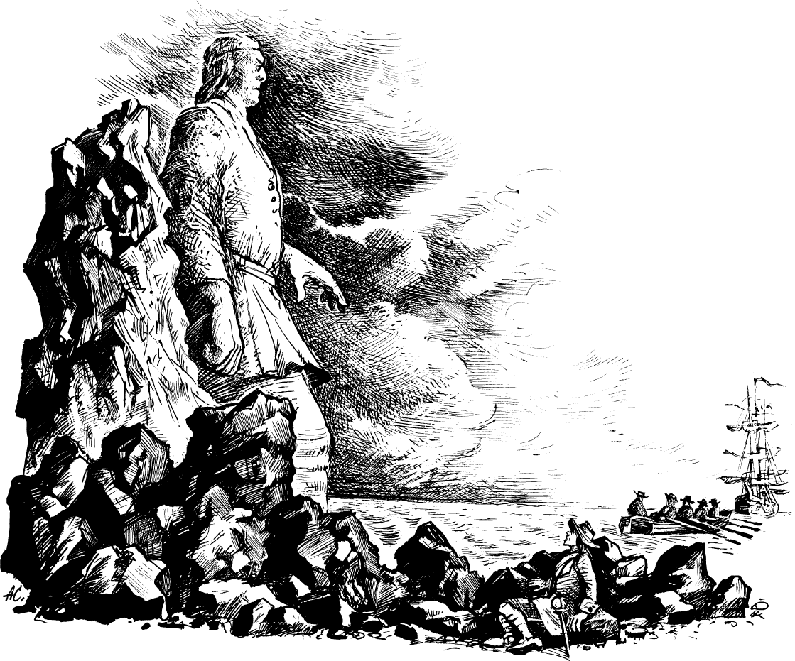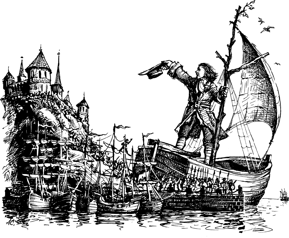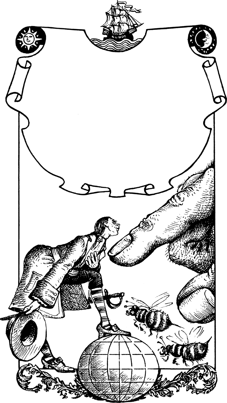 16 июня 1703 года стоявший на брамстеньге юнга увидел землю. 17-го мы подошли к острову или континенту (мы не знали), на южной стороне которого выдавалась в море коса и виднелась бухта, но не такой глубины, чтобы в нее мог войти корабль более ста тонн водоизмещения. Мы бросили якорь на расстоянии лиги от этой бухты, и капитан послал баркас с десятком хорошо вооруженных людей, снабдив их сосудами для воды, если таковая будет ими найдена. Я попросил у капитана позволения присоединиться к ним, чтобы осмотреть страну и сделать открытия, какие будут в моих силах. Прибыв к берегу, мы не нашли ни реки, ни источника и ни малейших признаков населения. Поэтому матросы разбрелись по побережью в поисках пресной воды, а я отправился один в противоположную сторону, но на расстоянии мили кругом тянулись все те же бесплодные и скалистые места. Почувствовав усталость и не находя ничего любопытного, я стал медленно возвращаться к бухте; море широко открывалось передо мною, и, к немалому удивлению, я увидел, что наши матросы уже сели в баркас и гребут что есть мочи по направлению к кораблю. Я уже собирался окликнуть их, хотя это было и бесполезно, как вдруг заметил, что их энергично преследует в море человек исполинского роста; вода едва доходила ему до колен, и он делал огромные шаги, но так как наши успели отъехать не меньше чем на пол-лиги от него и море кругом было покрыто острыми скалами, то чудовище не могло догнать лодку. Все это мне рассказали потом, а в тот момент у меня не хватило мужества наблюдать за исходом погони, и я со всех ног бросился удирать; запыхавшись, я взобрался на крутой холм, откуда мог обозреть окрестности. Земля кругом была хорошо возделана, но меня поразила высота травы на лугах, достигавшая двадцати футов.