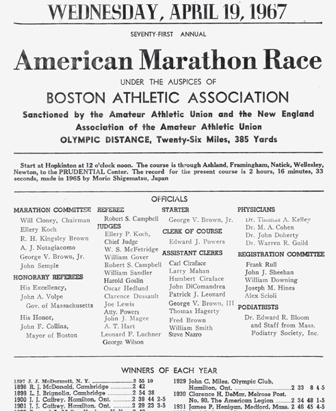 Im Jahr 1967 fand das American Marathon Race, besser bekannt als Boston Marathon, unter der Schirmherrschaft der Boston Athletic Association am 19. April statt; es war ein Mittwoch und der Patriot’s Day des US-Bundesstaats Massachusetts. (Seit einigen Jahren findet der Boston Marathon jährlich am dritten Montag im April statt, weil die Regierung des Bundesstaats die offizielle Feier des Tages auf dieses Datum festgelegt hat.) Es gefiel mir, dass die Einwohner von Massachusetts einen Gedenktag zur Erinnerung an die jungen amerikanischen Freiheitskämpfer begingen, die 1775 in Lexington und Concord in den ersten Schlachten der Amerikanischen Revolution gekämpft hatten. Der Marathon wurde 1897 als Teil des Patriot’s Day eingeführt, ein Jahr nach der Wiederbelebung der Olympischen Spiele in Athen.
