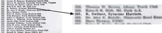 In Hopkinton angekommen parkten wir direkt vor der Highschool, was heutzutage undenkbar wäre, da dort inzwischen viele Tausend Sportler in Flotten von Sonderbussen anreisen und dort stundenlang auf den Start des Rennens warten. Arnie befahl John und mir, im beheizten Auto zu warten, während er den Umschlag mit unseren Startnummern und den Sicherheitsnadeln abholte. Da wir uns als Team gemeldet und die Anmeldeformulare zusammen abgeschickt hatten, würden die Organisatoren unsere Nummern unter dem Namen des Trainers oder des Kapitäns der Mannschaft ablegen, so wie bei jedem Bahn- oder Crosslauf. Tom begleitete Arnie, weil er noch die medizinische Bescheinigung für die Teilnahme brauchte. Arnie kam wenige Minuten später mit den zwei Nummern für Brust und Rücken samt Sicherheitsnadeln zurück. Die Nummern sahen aus wie Autokennzeichen. Wir suchten unsere Namen in der ausgedruckten Starterliste. »K. Switzer«, stand neben der Nummer 261. Der Anblick verursachte mir eine Gänsehaut. Auf der Liste waren 733 Namen. Ein großes Teilnehmerfeld. Arnie grummelte, dass es langsam außer Kontrolle geriete.