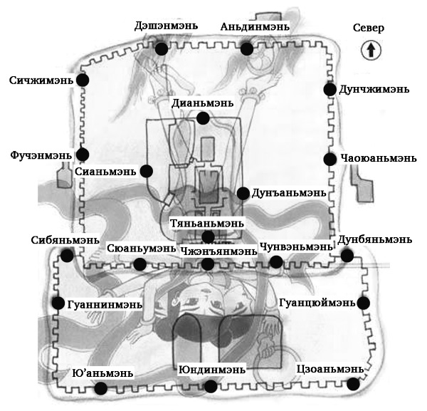 В центре – Императорский дворец, симметричные ворота с каждой из четырех сторон света. Внутренний город много раз реконструировали. С тех пор, как при династии Мин воздвигли основу городских стен в Великой столице династии Юань, всего было девять открытых ворот: Чжэнъянмэнь, Чунвэньмэнь, Сюаньумэнь, Чжаоянмэнь, Фучэнмэнь, Дунчжимэнь, Сичжимэнь, Аньдинмэнь, Дэшэнмэнь. Впоследствии границы Внешнего города были расширены, открыли еще семь ворот: Дунбяньмэнь, Сибяньмэнь, Гуанцюймэнь, Гуаннинмэнь, Цзоаньмэнь, Юаньмэнь, Юндинмэнь; к Запретному городу добавили ворота: Тяньань, Дэань, Дунъань, Сиань. Так сформировалась структура: «девять внутренних и семь внешних ворот Запретного города»