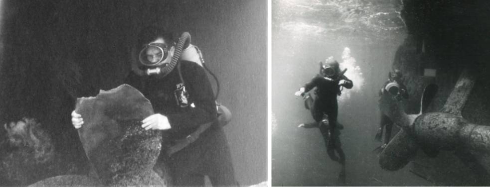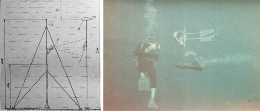 Калганов рассказывал: «Мы не стали грузить её в лодку, а решили буксировать за ней, прикрепив кончиком к банке (сидению в шлюпке) и заглубив примерно на метр. Я как молодой сел на вёсла, и мы не спеша направились к полигону. Так как лодка была плоскодонной, то сильно рыскала по курсу. Вот так идём мы потихоньку, а солнышко греет, ветра нет, практически полный штиль – красота. Вдруг я почувствовал, что лодка повела себя по-другому – стало легче грести, увеличилась скорость. Оказалось, что от постоянного рысканья лодки перетёрся буксирный трос нашей вертушки, и она утонула! Мы хватились её, бросили небольшой якорь-кошку, надели акваланги, ласты, маски и пошли под воду искать пропажу. Нашли её достаточно быстро. Видимость была метров десять или даже больше; она как ушла вертикально вниз, так и на дно встала ровненько, как "пенёк". Что же делать? Самим нам её не поднять, верёвки длинной на лодке нет – нужно возвращаться за помощью. Володя знаками объяснил, что он пойдёт на "Нерей" на лодке, а я должен сидеть у найденной потеряшки. Вот и сижу под водой, смотрю на вертушку (как бы не убежала). Солнышко пробивает воду до светлого песочка – вообще-то красота, но… ждать и догонять – хуже всего. Время идёт медленно, тем более, что часов у меня нет. Сколько времени прошло – неизвестно. Сижу я, сижу и вдруг слышу, что сработал указатель аварийного остатка воздуха в баллонах акваланга – чёткий такой щелчок. А нам ещё на теоретических занятиях по подводному плаванию вдалбливали, что услышав такой щелчок нужно заканчивать работу и возвращаться на поверхность. Вот тут уж мне совсем "грустно" стало – помощи пока не видно. Когда ребята придут – неизвестно. Нарушать ПТБ (правила техники безопасности) вроде нельзя. Мне нужно всплывать, а что же делать с вертушкой? Я был совсем молодым, без практики подводных работ, вот и думал, что делать. Посидел ещё немного, посидел и пошёл наверх. А когда всплыл, то увидел лодку с ребятами метрах в 10-15 от меня… Конечно, нашли вертушку, установили её на мачте под водой. Мне же А.В. Майер выразил своё "фе", сказав, что воздуха вполне хватило бы до прихода помощи. Я тогда обиделся: "ведь после аварийного сигнала столько времени ещё просидел под водой у вертушки, а он меня…" Но потом понял, что и на последнем вдохе из акваланга я мог бы спокойно всплыть – всего-то 20 метров до поверхности, но было уже поздно – дело сделано. Вот так, на ошибках других, а чаще своих и приходил к нам опыт. Лаборатории подводных исследований лично я многим обязан и науке по отношению к работе, и как это пафосно ни звучит, в формировании характера».