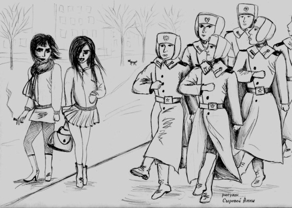 Ясно, что парни поняли мой прикол. Взвод строевым шагом обгонял девчонок, а те, чуток приняв вправо, ёжась от холода, освободили нам дорогу.