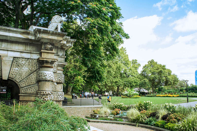 Die Verlängerung der Lord North Street führt zur viel befahrenen Horseferry Road. Wer mag, unternimmt hier einen Abstecher links zur Themse für einen schönen Ausblick von der Lambeth Bridge – dabei passiert man die Hauptverwaltungen der Firma Burberry (rechts) und des Spionageabwehrdienstes MI5 (ein klotziger Steinbau an der Ecke zur Uferstraße). Sonst überqueren wir die Horseferry Road, gehen ein paar Schritte nach rechts und durch den kleinen Park St John’s Gardens, dann rechts in die Page Street und befinden uns auf einmal in einer anderen Welt. Die mehrstöckigen denkmalgeschützten Wohnblöcke aus den Jahren 1928 bis 1930 entwarf der damals angesehenste britische Architekt, Sir Edwin Lutyens. Der Grundbesitzer, der Zweite Herzog von Westminster, machte es zur Bedingung des Projekts, dass der Stadtrat von Westminster die 532 Wohnungen ausschließlich an Familien der Arbeiterklasse vermietete. Die schönen Conciergehäuschen werden heute von kleinen Betrieben – ein Schuster, ein Installateur, ein Barbier – benutzt.