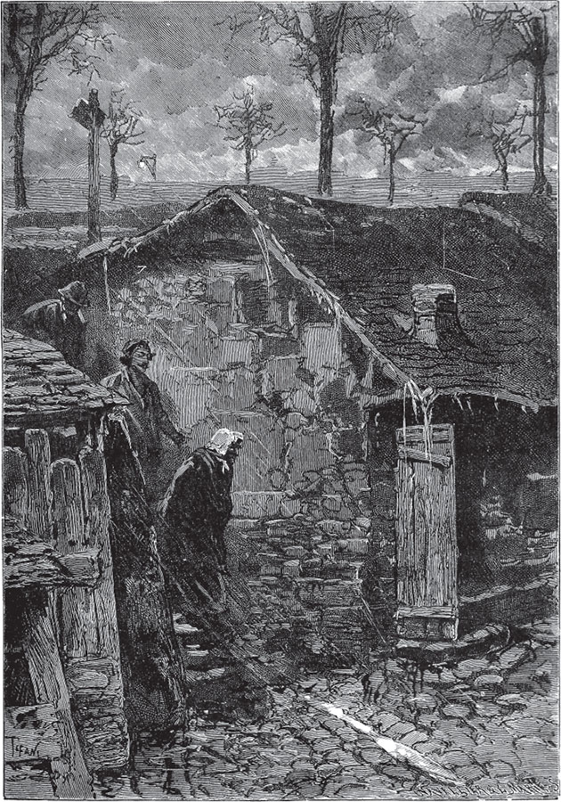 Лестница, вырытая во влажной жирной земле, вела к некоему подобию обширного рва, к одной из отвесных граней которого прилепилась низкая грязная лачуга с потрескавшимися стенами; ее черепичная, замшелая крыша едва доходила до поверхности земли, где стоял Родольф; два-три сарая из трухлявых досок – погреб, сарай и крольчатник – дополняли этот вертеп.