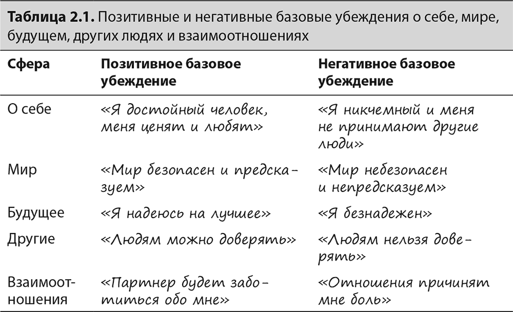 Базовые убеждения (синоним – глубинные убеждения) – это принципы и идеи, которые лежат в основе идентичности человека. Они отражают представление о значимых сферах: о себе, о мире, о будущем, о других людях, об отношениях. Примеры для каждой сферы представлены в табл. 2.1. Базовые убеждения в значительной степени ответственны за повторяющиеся эмоции и поведение человека, включая зависимое поведение. Так, если человек верит, что его ценят и любят, он скорее будет чувствовать радость и удовлетворенность, чем тот, кто убежден в своей никчемности и непринятии со стороны окружающих. Если человек верит, что мир безопасен и предсказуем, он будет чувствовать себя свободно и идти на разумный риск в реальной жизни, в отличие от того, кто считает мир небезопасным и непредсказуемым. Люди с устойчивыми негативными убеждениями о себе, своей жизни, будущем, других людях и отношениях склонны к тревоге и депрессии (Clark & Beck, 2010; Beck et al., 1979).