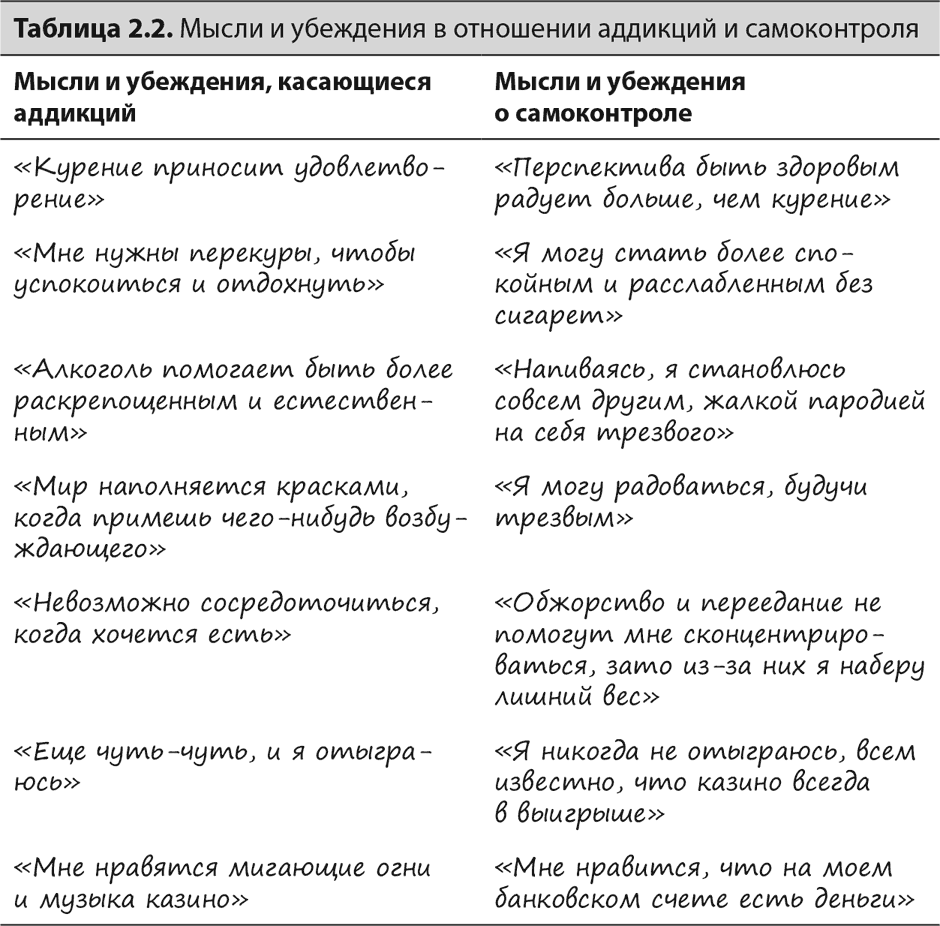 В противоположность мыслям и убеждениям, связанным с аддикциями, существуют убеждения и мысли о способности контролировать себя. Мысли о самоконтроле являются основополагающими для процесса восстановления. Например: «Я гораздо больше доволен жизнью, будучи здоровым, чем когда курю», «Когда я в алкогольном опьянении, это не настоящий я, а просто пьяная версия меня» и «Мне может быть весело и без возбуждающих веществ» (см. табл. 2.2). Люди, пытающиеся побороть аддикцию (и их терапевты), часто недооценивают количество времени и усилий, необходимых для формирования новых убеждений и мыслей о самоконтроле. Они порой забывают, что мысли и убеждения, провоцирующие аддикции, могли развиваться и повторяться в мышлении десятилетиями. Пациентов может фрустрировать медленный прогресс в формировании убеждений о самоконтроле, таких, которые были бы более значимыми, чем мысли, связанные с аддикциями. Пациентам и терапевтам следует быть более терпеливыми и настойчивыми в совместной работе над этими важными изменениями.
