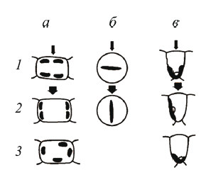 Рис. 13. Адаптации растений к свету на клеточном уровне. Схема изменения положения хлоропластов и хроматофоров в клетках растений при разной степени освещенности (из T.K. Горышиной, 1979): а — ряска; б — моугеотия; в — селагенелла; 1 – слабый свет; 2 — сильный свет; 3 — темнота