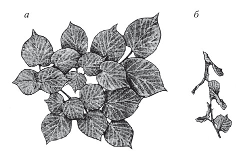 Рис. 15. Адаптации растений к свету на организменном уровне. Листорасположение у подроста липы мелколистной в разных условиях освещения (из Т.К. Горышиной, 1979): а — под пологом леса; б— на открытом месте