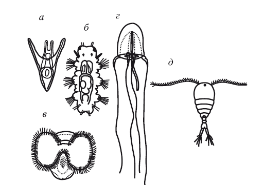 Рис. 16. Увеличение относительной поверхности тела у планктонных организмов (по С.А. Зернову, 1949). Расчлененные формы: а — личинка берегового морского ежа; 6—личинка многощетинкового червя нереис; в — личинка береговой улитки; г – медуза; д — веслоногий рачок