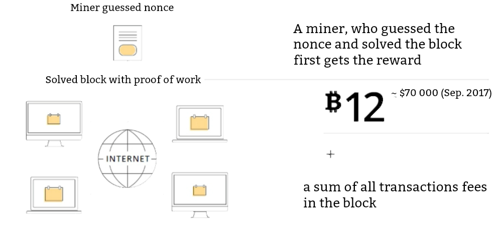 Un minero recibe una recompensa por extraer un bloque. Actualmente, la recompensa es de 12 bitcoins. Es decir, si introduce un bloque bien formado en el sistema, obtendrá tal recompensa. Por cierto, el primero (Génesis) fue creado por Satoshi Nakamoto. Cualquiera podría encontrarlo y obtener 50 bitcoins por él.