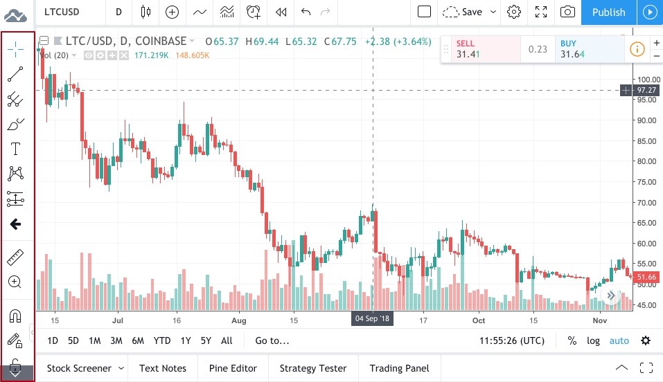 Il primo pulsante è un tipo di cursore. Di seguito sono disponibili strumenti di analisi tecnica. Consideriamo la linea di tendenza perché utilizzerai spesso questo strumento.