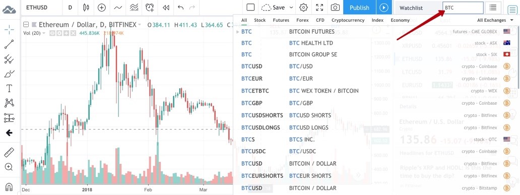Un menu di citazioni è in alto. È una funzione molto conveniente che consente di archiviare tutti gli asset con cui lavori. Per selezionare l'asset desiderato, inserisci le prime lettere della valuta nella barra di ricerca. Avrai un menu per la selezione. Qui scegli non solo la criptovaluta ma anche lo scambio su cui la scambierai.