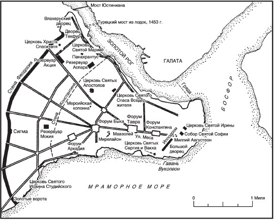 Те, кто не смог по достоинству оценить эти географические преимущества, были не первыми, не заметившими достоинств города. За несколько веков до этого Греция, будучи ведущей мировой державой, столкнулась с экономическими трудностями, и многие из ее городов-государств поощряли своих граждан уезжать в другие края, из которых на родину можно привезти пищу и прочие предметы первой необходимости. В результате многие греки основали на берегах Черного моря независимые самоуправляемые города, известные как колонии. В VII веке до н. э. группа переселенцев из Мегары выбрала себе предводителя по имени Виз. Перед отъездом из родного города они отправились к любимому оракулу, надеясь, что он посоветует, где основать колонию. В свойственной оракулам манере ответ прозвучал как загадка: «Идите и поселитесь напротив города слепых». Мегарийцы сели на суда и добрались до южного входа в Босфор, где на азиатском берегу Мраморного моря стоял греческий колониальный город Халкидон (рядом с современной Модой). С удовольствием окинув взглядом прекрасный пейзаж, представший перед ними, мегарийцы высадились на треугольнике земли, вдающемся в море на противоположном (то есть европейском) берегу. Переселенцы, заметившие его выгодное расположение так же быстро, как впоследствии Константин, решили, что жители Халкидона, которые могли выбирать место для города по своему усмотрению, и есть те самые «слепые», о которых говорил оракул. Они основали свое поселение на мысе. Впоследствии, несмотря на все преимущества, город предстал перед Константином слишком маленьким для столицы. В 324 году он наметил новые границы для городских стен и повелел выстроить дворец, необходимые административные здания, форум и церковь, которую посвятил Софии, Святой (Божественной) Мудрости. Работы были завершены через шесть лет, и в 330 году н. э. Константин объявил город столицей.