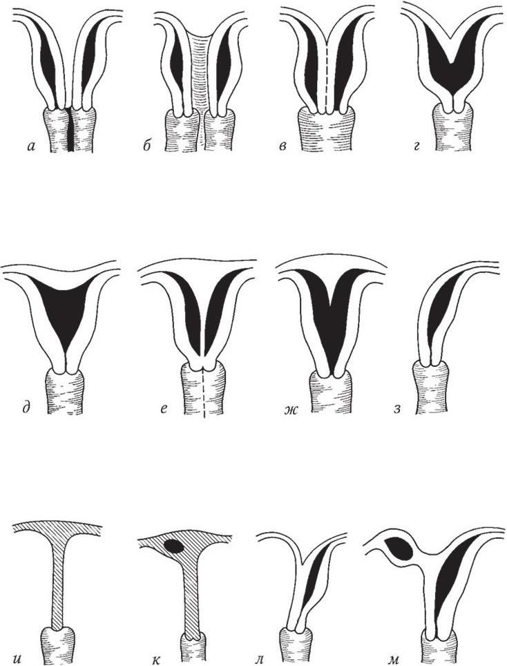 а – uterus didelphus; б – uterus duplex et vagina duplex; в – uterus bicornis bicollis; г – uterus bicornis unicollis; д – uterus arcuatus; е – uterus septus duplex; ж – uterus subseptus; з – uterus unicornis; и, к, л, м – uterus bicornis rudimentarius