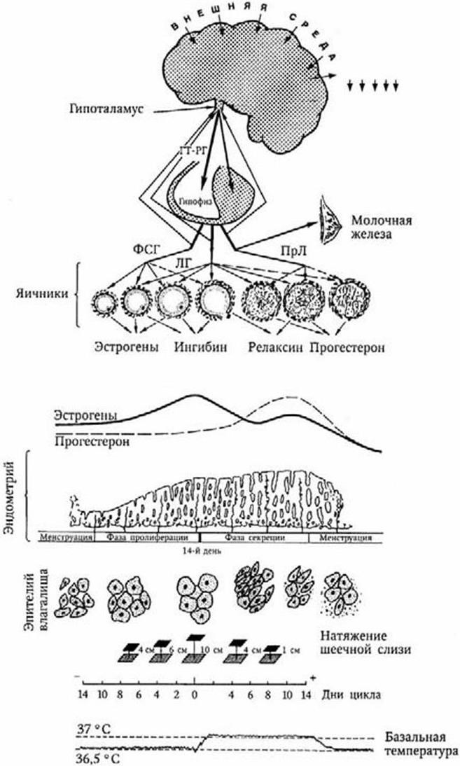 М е н с т р у а л ь н ы й ц и к л – одно из проявлений сложного биологического процесса в организме женщины, характеризующегося циклическими изменениями функции половой (репродуктивной) системы, сердечно-сосудистой, нервной, эндокринной и других систем организма. Нормальный менструальный цикл включает три компонента: 1) циклические изменения в системе гипоталамус – гипофиз – яичники; 2) циклические изменения в гормонально-зависимых органах (матке, маточных трубах, влагалище, молочных железах); 3) циклические изменения (колебания функционального состояния) нервной, эндокринной, сердечно-сосудистой и других систем организма (рис. 11).