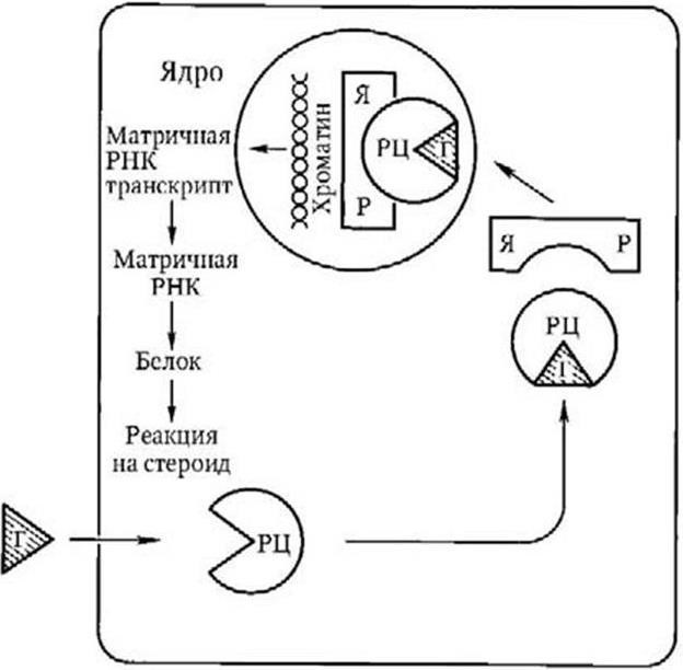 Г – гормон; РЦ – рецептор цитоплазматический; ГРЦ – комплекс гормон – рецептор цитоплазматический; ЯР – ядерный рецептор; ЯРРЦГ – комплекс ядерный рецептор – рецептор цитоплазматический – гормон