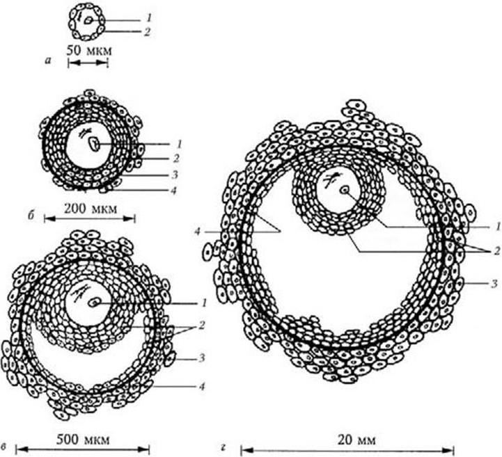 а – примордиальный фолликул; б, в – зреющий фолликул; г – зрелый фолликул: