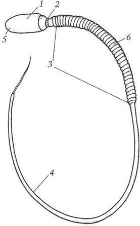 1 – головка; 2 – шейка; 3 – промежуточный отдел; 4 – жгутик (хвост); 5 – акросома; 6 – митохондриальная спираль