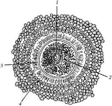 1 – ядро: 2 – протоплазма: 3 – блестящая оболочка: 4 – фолликулярные клетки, образующие лучистый венец