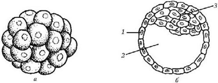 Рис. 16. Развитие плодного яйца млекопитающих. Стадии морулы (а) и бластоцисты (б):