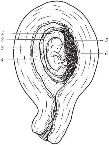 1 – амниотическая полость; 2 – гладкий хорион: 3 – decidua capsularis; 4 – decidua parietalis; 5 – ветвистый хорион (будущая плодная часть плаценты): 6 – decidua basalis (будущая материнская часть плаценты)