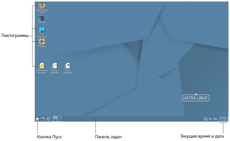РАБОЧИЙ СТОЛОсновной экран Astra Linux называется рабочим столом. На нем расположены значки-пиктограммы, предназначенные для вызова программ или папок с данными.